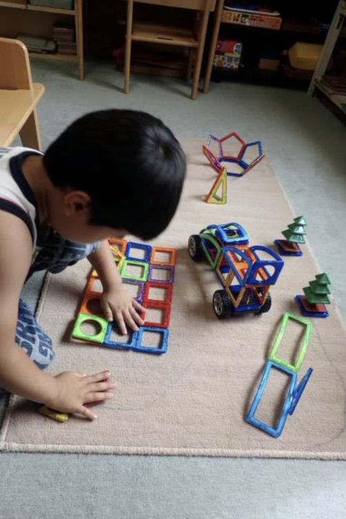 マグ・フォーマーは磁石だから力がなくても簡単。ひらめきのスピードに合わせてつなげられます。