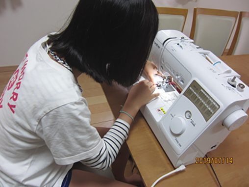 「いただいたミシンと布で巾着袋の製作を始めた中学生にミシ…